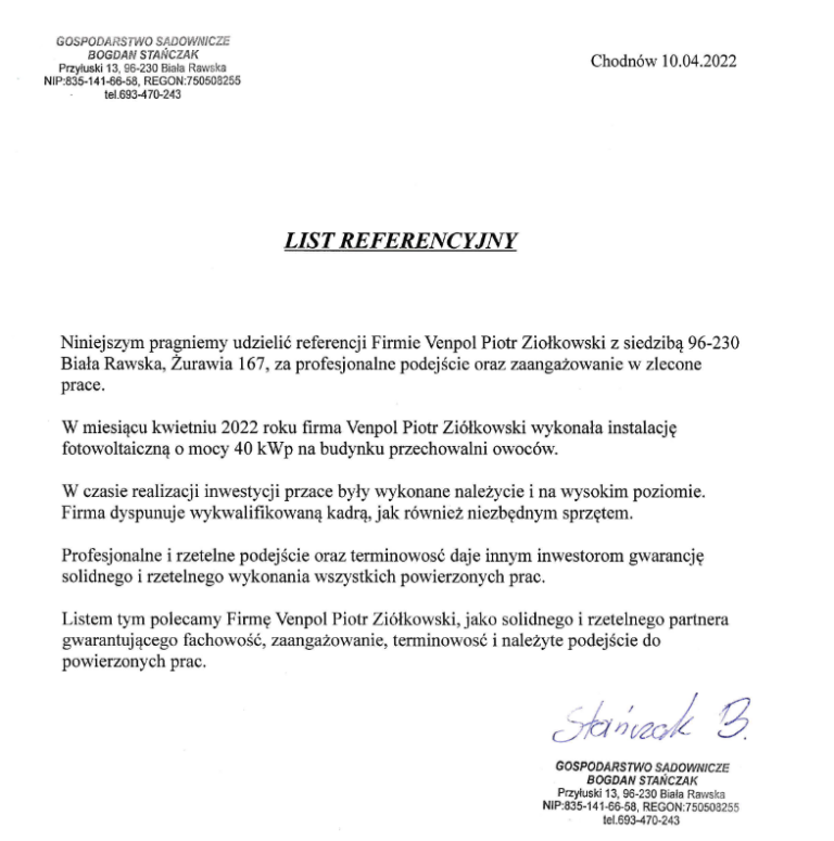Instalacja fotovoltaiczna wykonana została profesjonalnie, w krótkim terminie, w dobrej cenie z pełną dokumentacją. Wszystko działa ok. Firma godna polecenia. Oceniam firmę na 5. Sławek